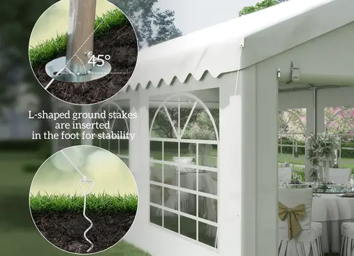 Heavy Duty Frame: The galvanized steel tube diameter of 1.5 inches (38 mm) provides strong support and stability. Additional roof stiffeners make the event tent more stable and more wind-resistant on the ground. Also included is a set of guy ropes, ground stakes and expansion screws to help hold up its structure overall.